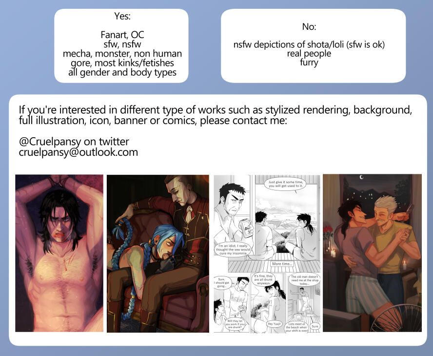 be requested to pay an extra fee.- Commercial use must be discussed previously and an extra fee will be charged.- The client is free to distribute the work however they want as long as it's not commercial use. If possible I will ask you to credit me (@cruelpansy) when it's posted online.